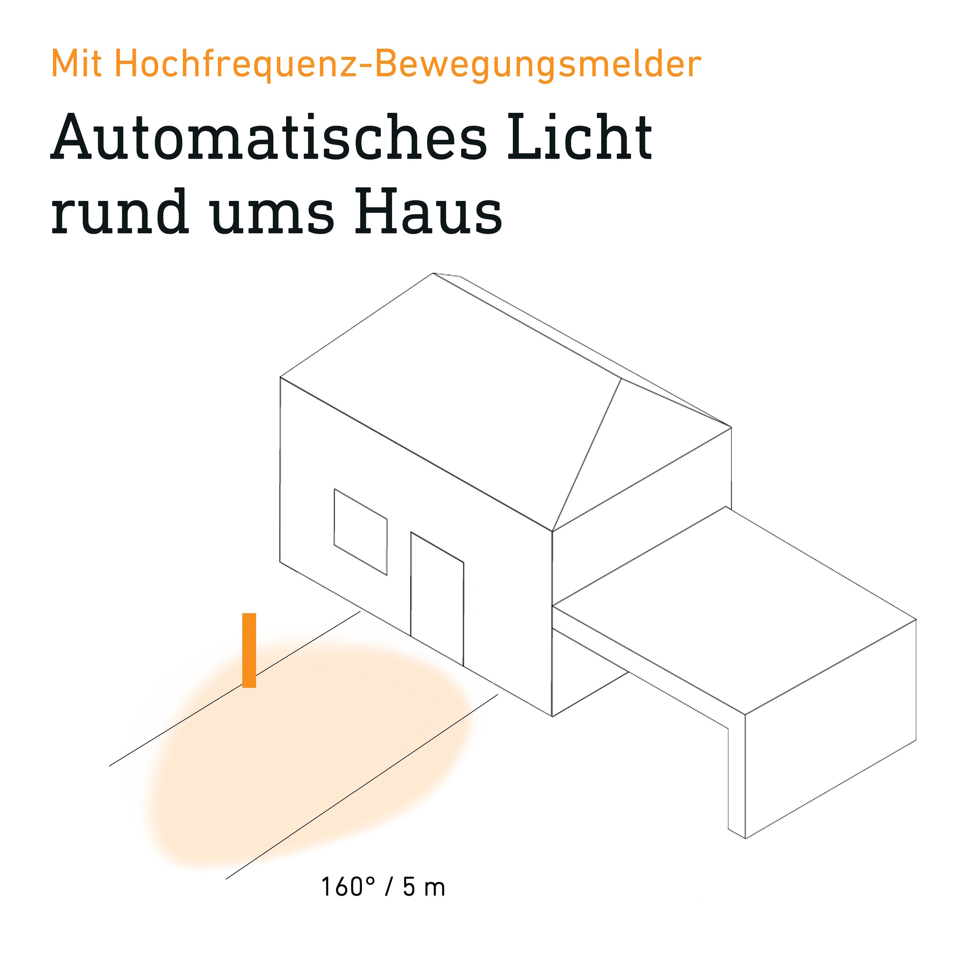 • Automatisches Licht dank unsichtbar integriertem 160° Hochfrequenz-Sensor mit bis zu 5 m Erfassung bei Bewegung