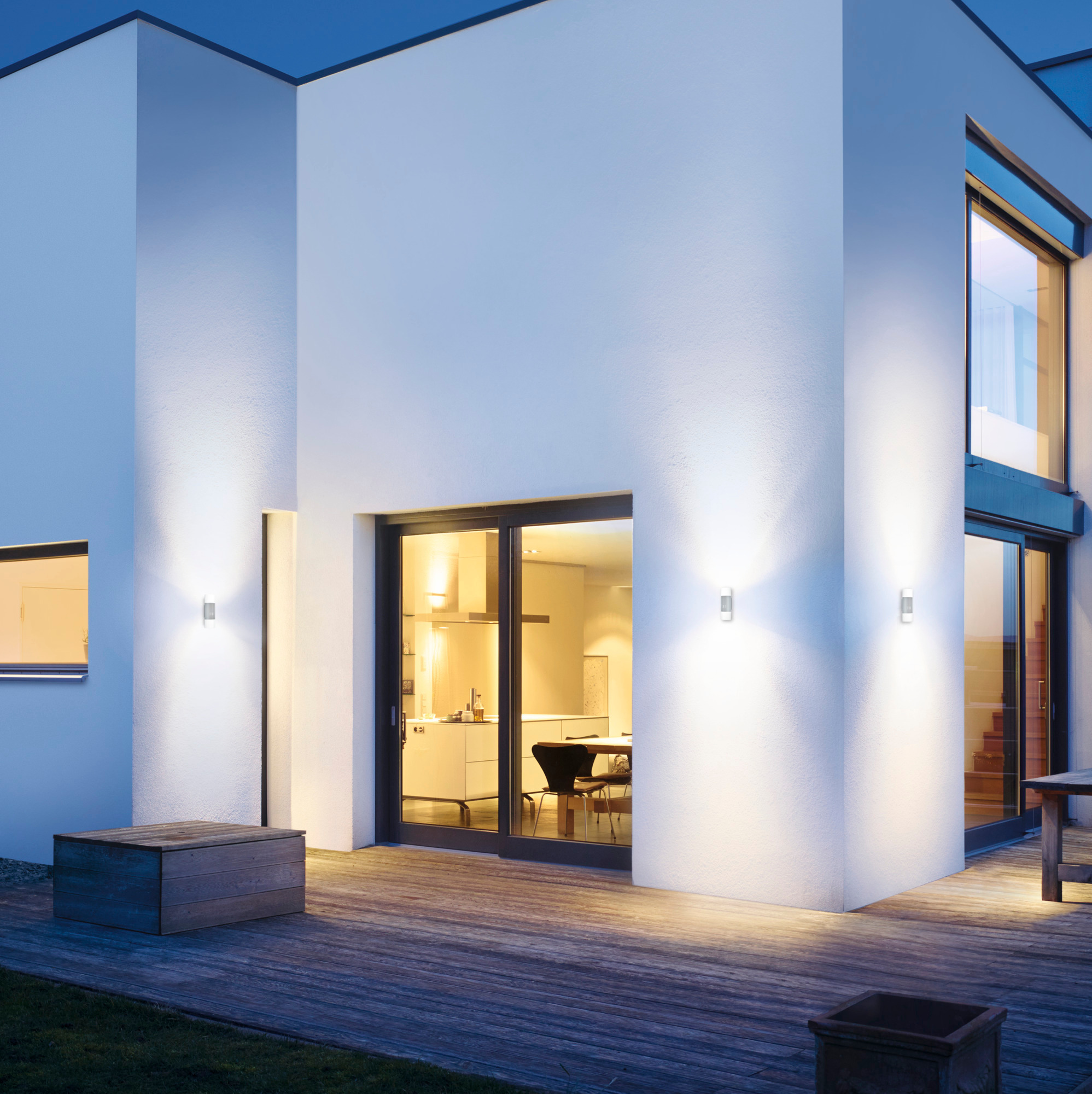 Gleiche Technologie, noch mehr Wirkung: Wenn es etwas mehr Ambiente Licht an Ihrem Haus sein darf können wir Ihnen mit der L 910 S eine genauso schöne wie effiziente Up-/Downlight-Lösung bieten. Wie bei ihrer kleinen Schwester liefern Ihnen auch hier die wartungsfreien und verbrauchsarmen LEDs dank des zuverlässigen IR-Sensors ästhetisches Ambientelicht wann immer Sie möchten. Und wenn Sie sie vernetzen, schalten sie gleichzeitig an und aus. Ein Effekt, den nicht nur Ästheten zu schätzen wissen.