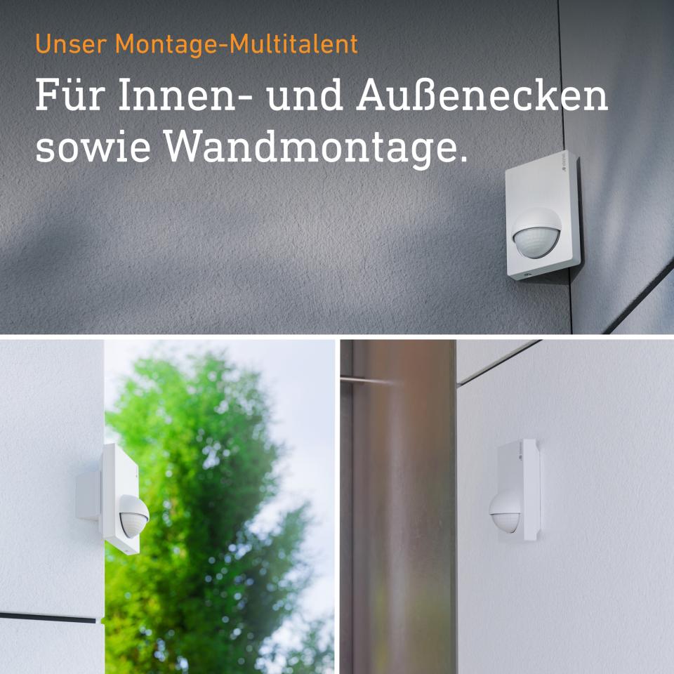 • Für die Wand- oder Eckmontage (mit optionalem Eckwandhalter) im Innen- und Außenbereich (IP 54), ideal für die Überwachung großer Grundstücke und Außenanlagen, z.B. Hausfronten und Einfahrten